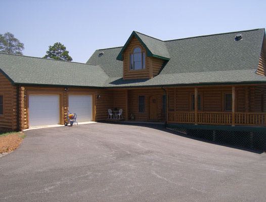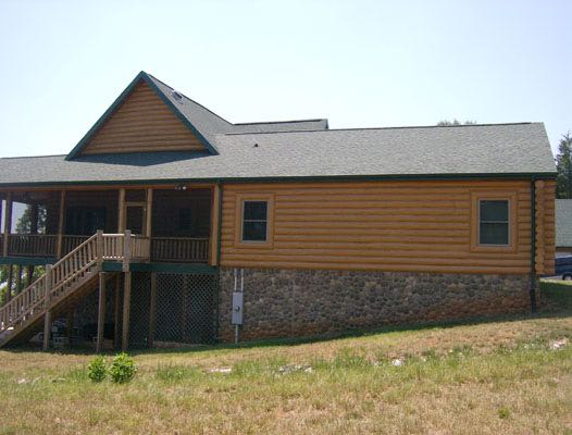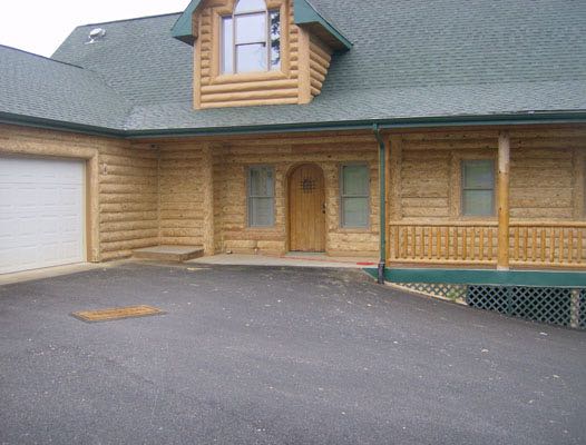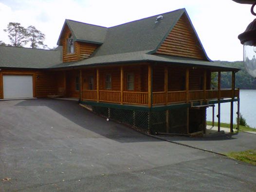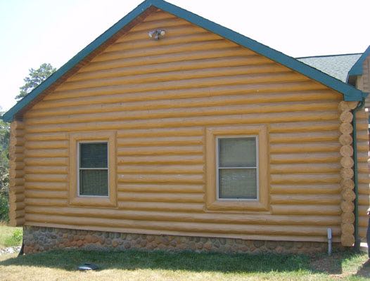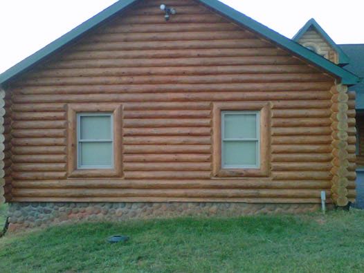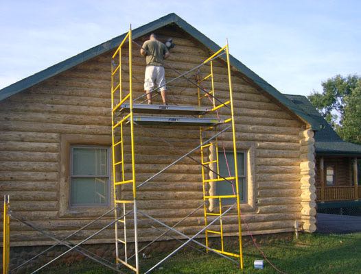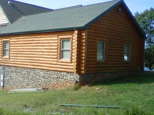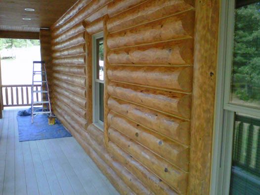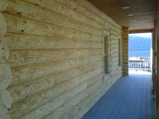 This log home is a work in progress.  The logs were sprayed with a vinyl coating that has begun to fail.  Due to the thickness of the coating, we have to grind the coating off the logs, where chemical stripping or media blasting would not be efficient without causing damage to the logs.  To complete this restoration, we will wash, recaulk, and stain the log home.